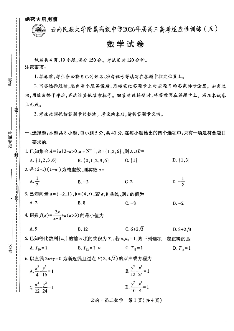 云南民族大学附属高级中学2026年届高三高考适应性训练(五)数学试题(含答案).pdf