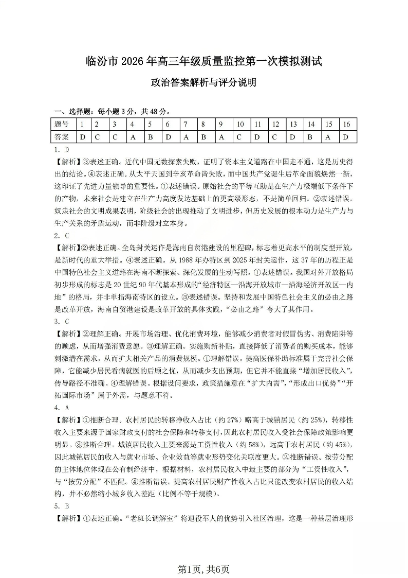 临汾市2026年高三年级质量监控第一次模拟测试 政治答案.pdf