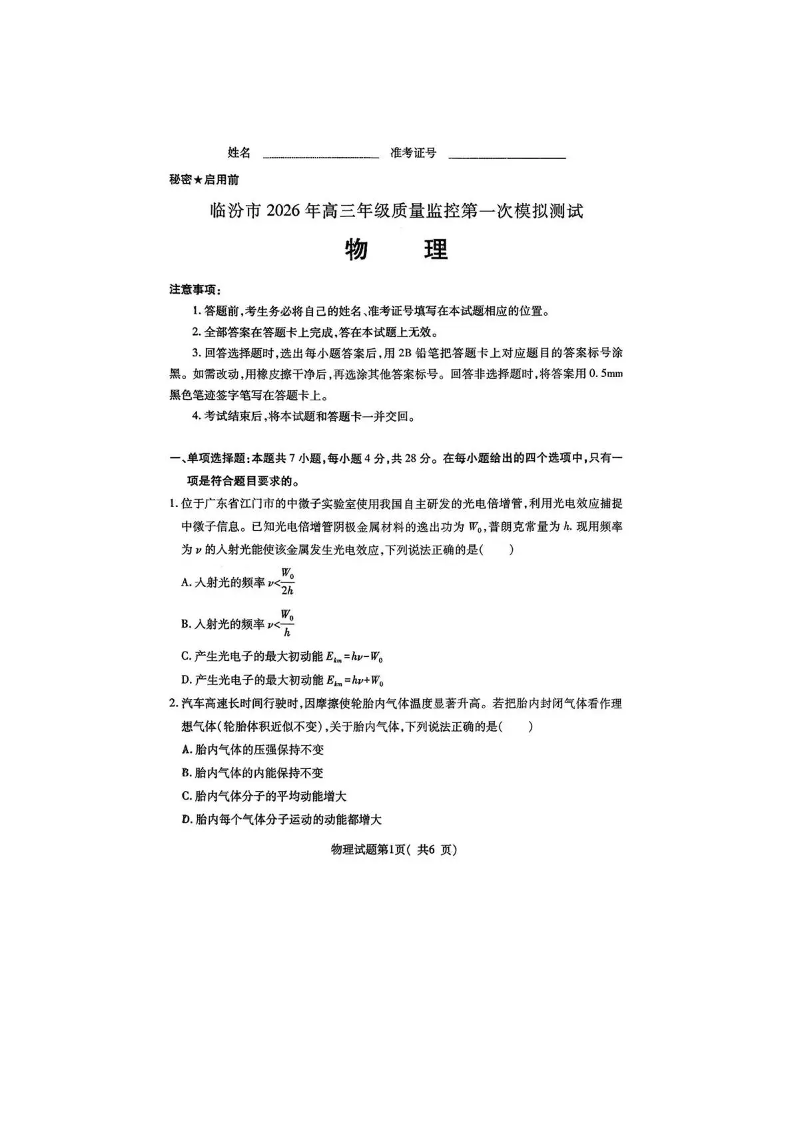 临汾市2026年高三年级质量监控第一次模拟测试 物理.pdf
