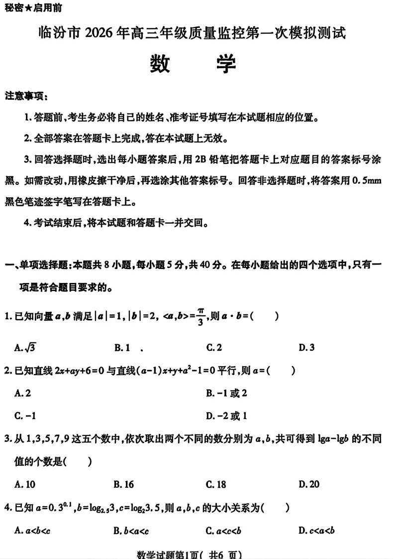临汾市2026年高三年级质量监控第一次模拟测试 数学.pdf