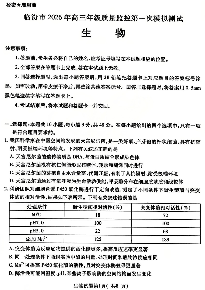 临汾市2026年高三年级质量监控第一次模拟测试 生物.pdf