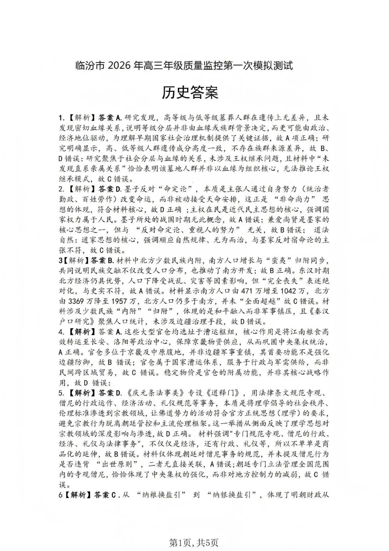 临汾市2026年高三年级质量监控第一次模拟测试 历史答案.pdf
