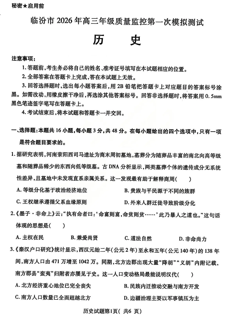 临汾市2026年高三年级质量监控第一次模拟测试 历史.pdf