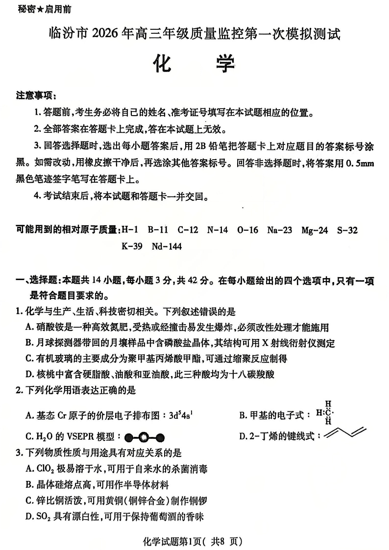临汾市2026年高三年级质量监控第一次模拟测试 化学.pdf