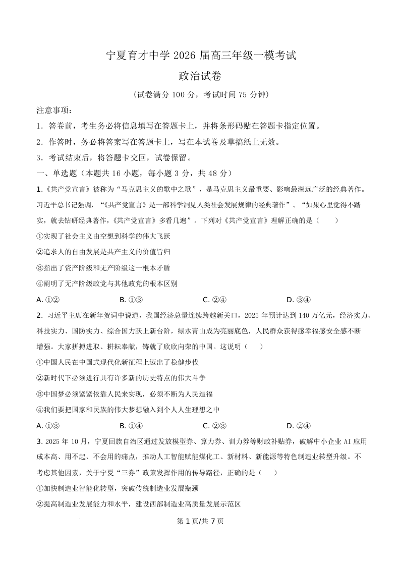 宁夏育才中学2026届高三年级一模考试 政治.docx