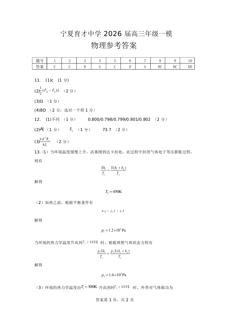 宁夏育才中学2026届高三年级一模考试 物理答案.docx