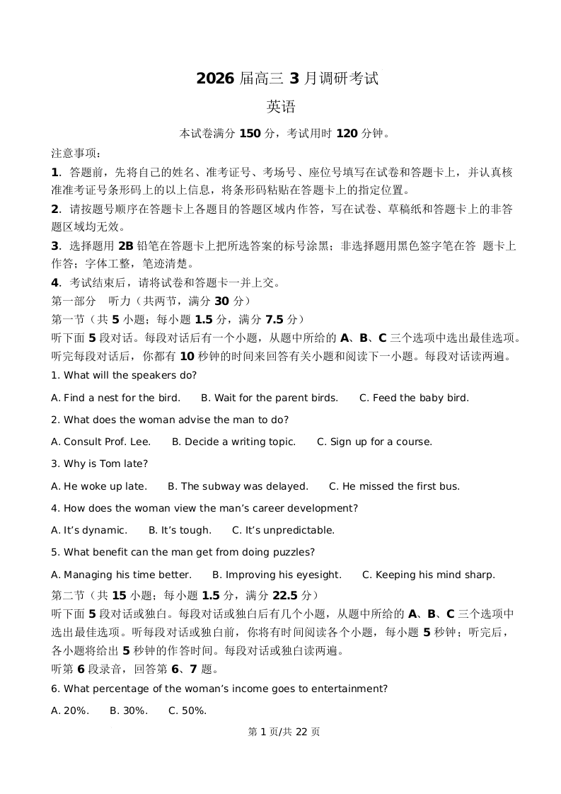 湖北省宜昌市2026届高三下学期3月调研考试 英语答案.docx