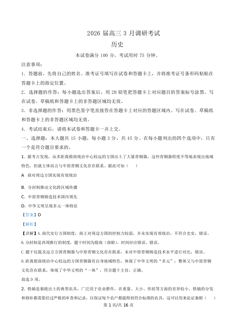 湖北省宜昌市2026届高三下学期3月调研考试 历史答案.docx