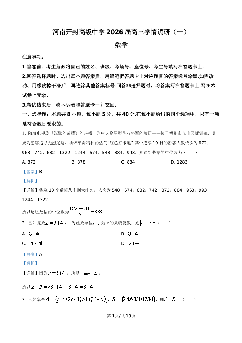 河南省开封高级中学2026届高三下学期学情调研(一)数学答案.docx