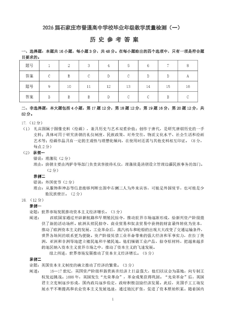 2026届石家庄市普通高中学校毕业年级教学质量检测(一)历史答案.pdf
