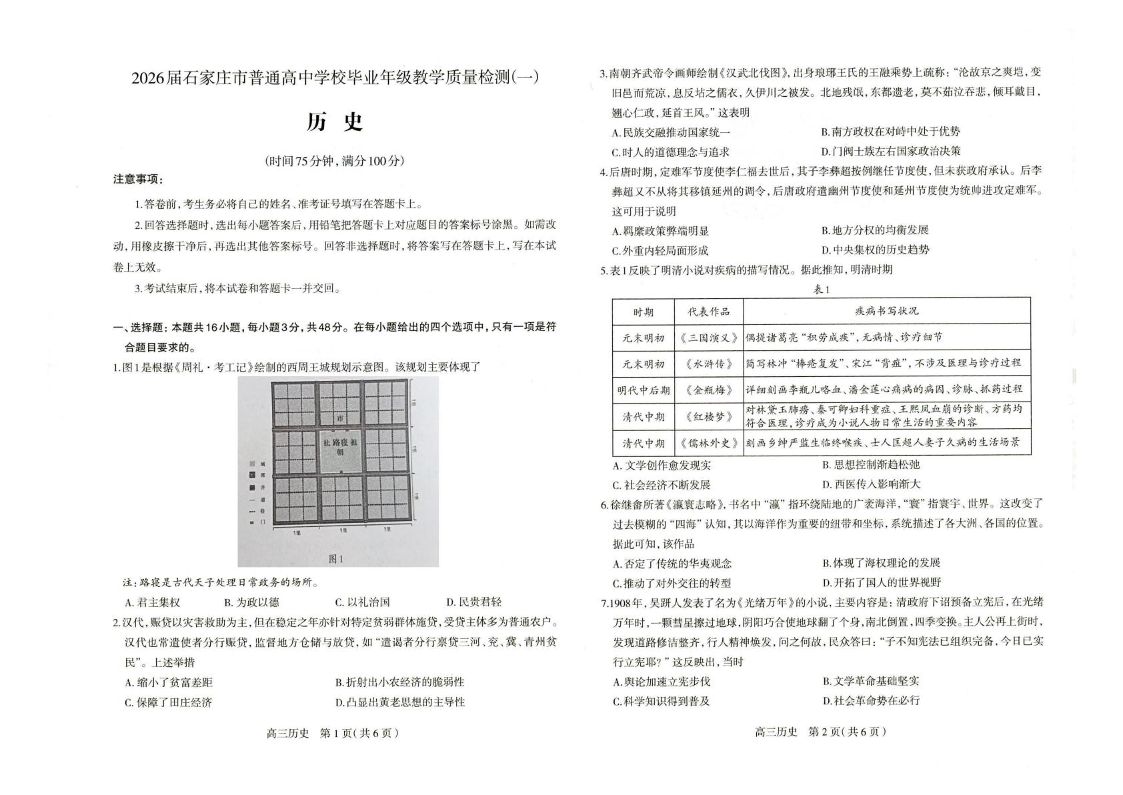 2026届石家庄市普通高中学校毕业年级教学质量检测(一)历史.pdf