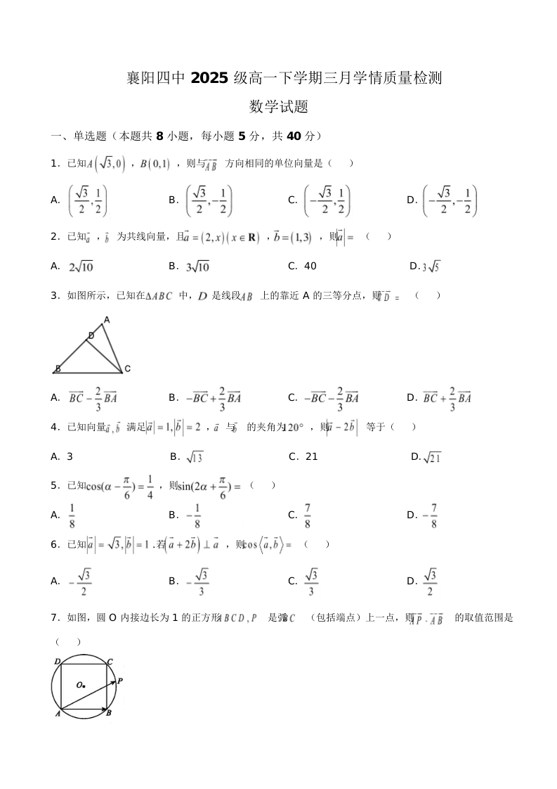 湖北省襄阳市第四中学2025-2026学年高一下学期3月阶段检测 数学试题(含答案).docx
