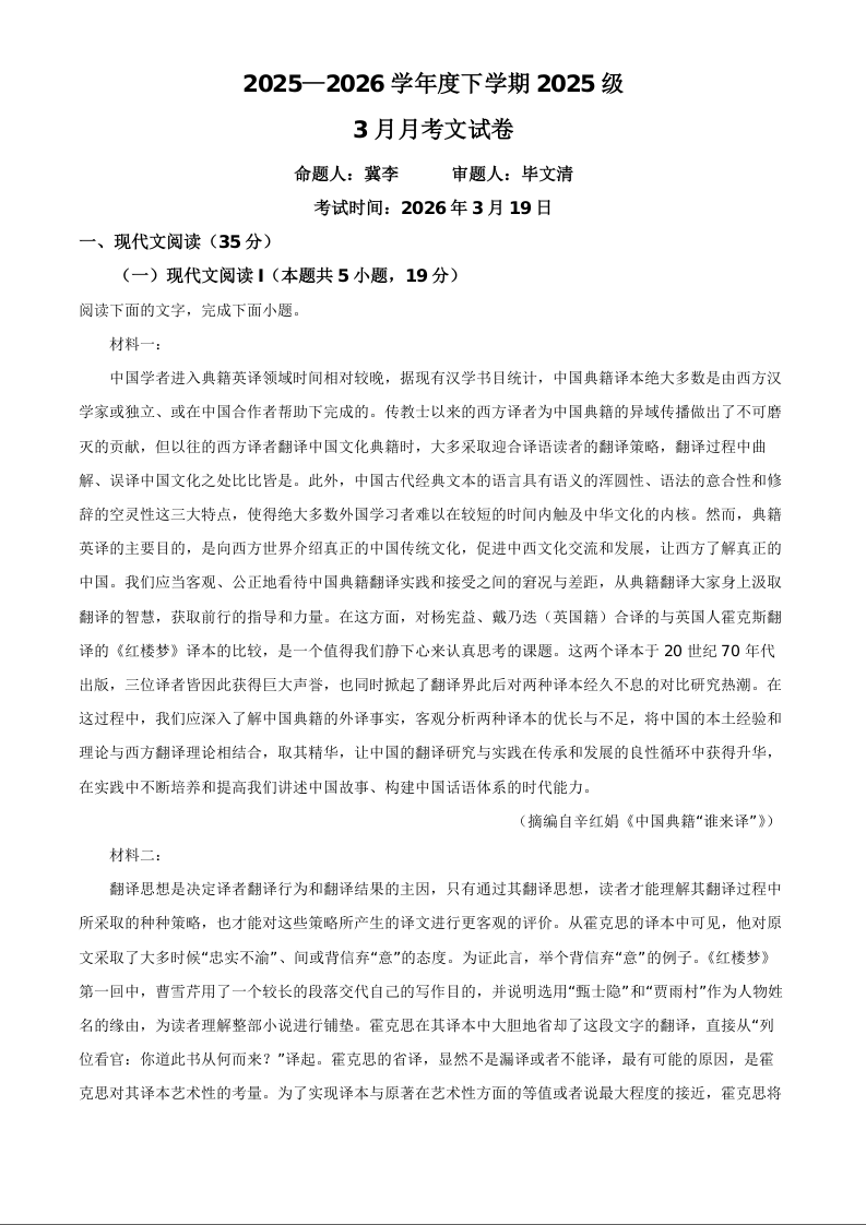 湖北省沙市中学2025-2026学年高一下学期3月月考 语文答案.docx
