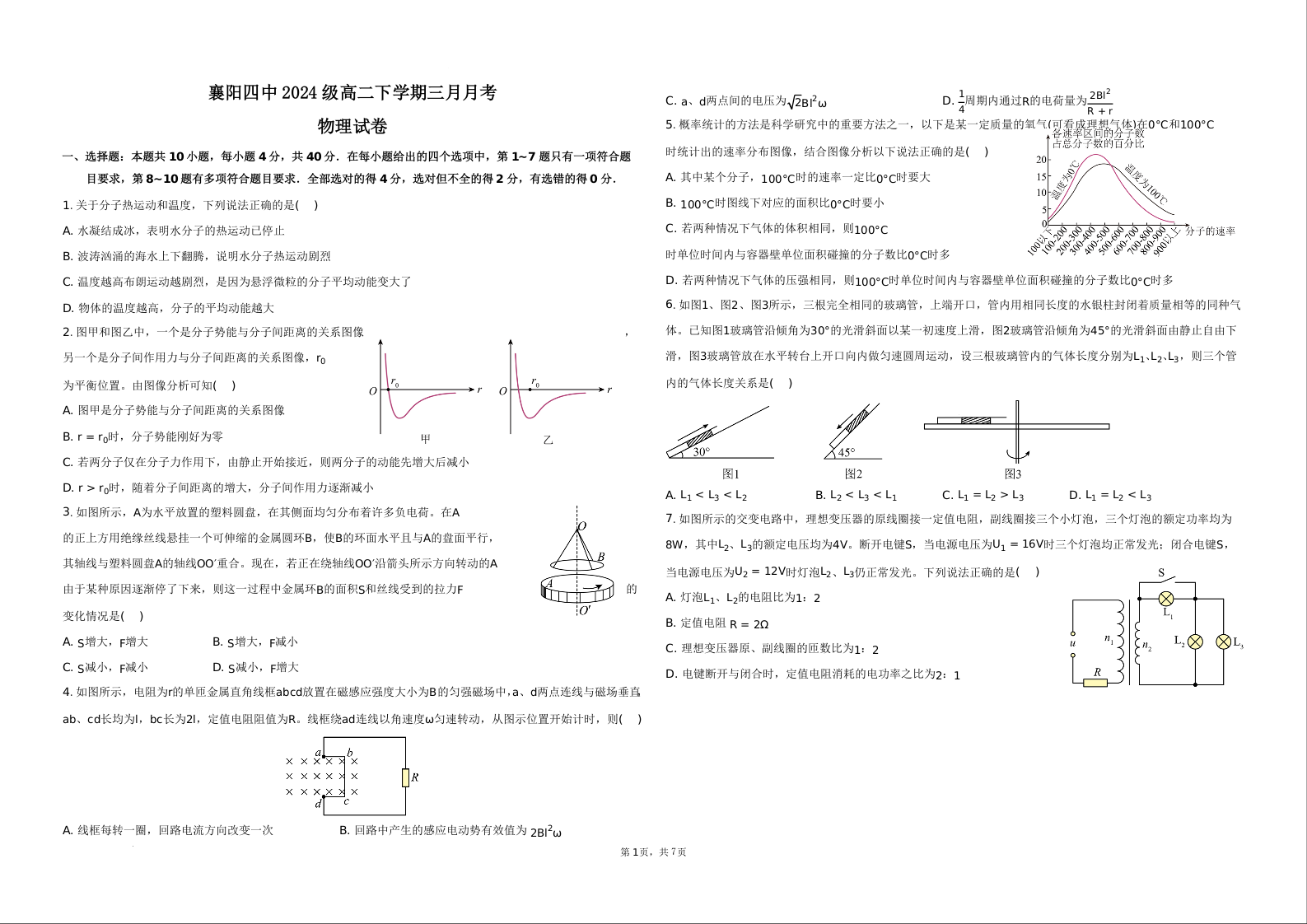 湖北省襄阳市第四中学2025-2026学年高二下学期3月阶段检测 物理试题(含答案).docx