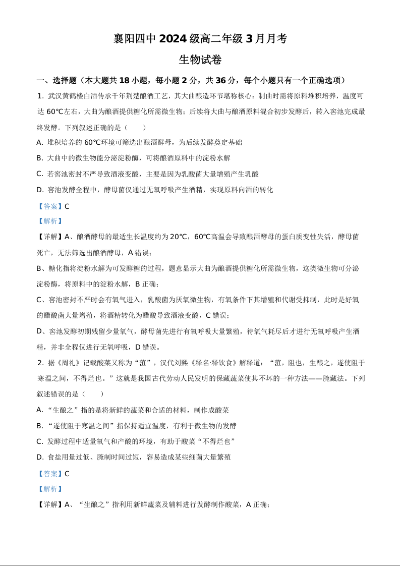 湖北省襄阳市第四中学2025-2026学年高二下学期3月阶段检测 生物答案.docx