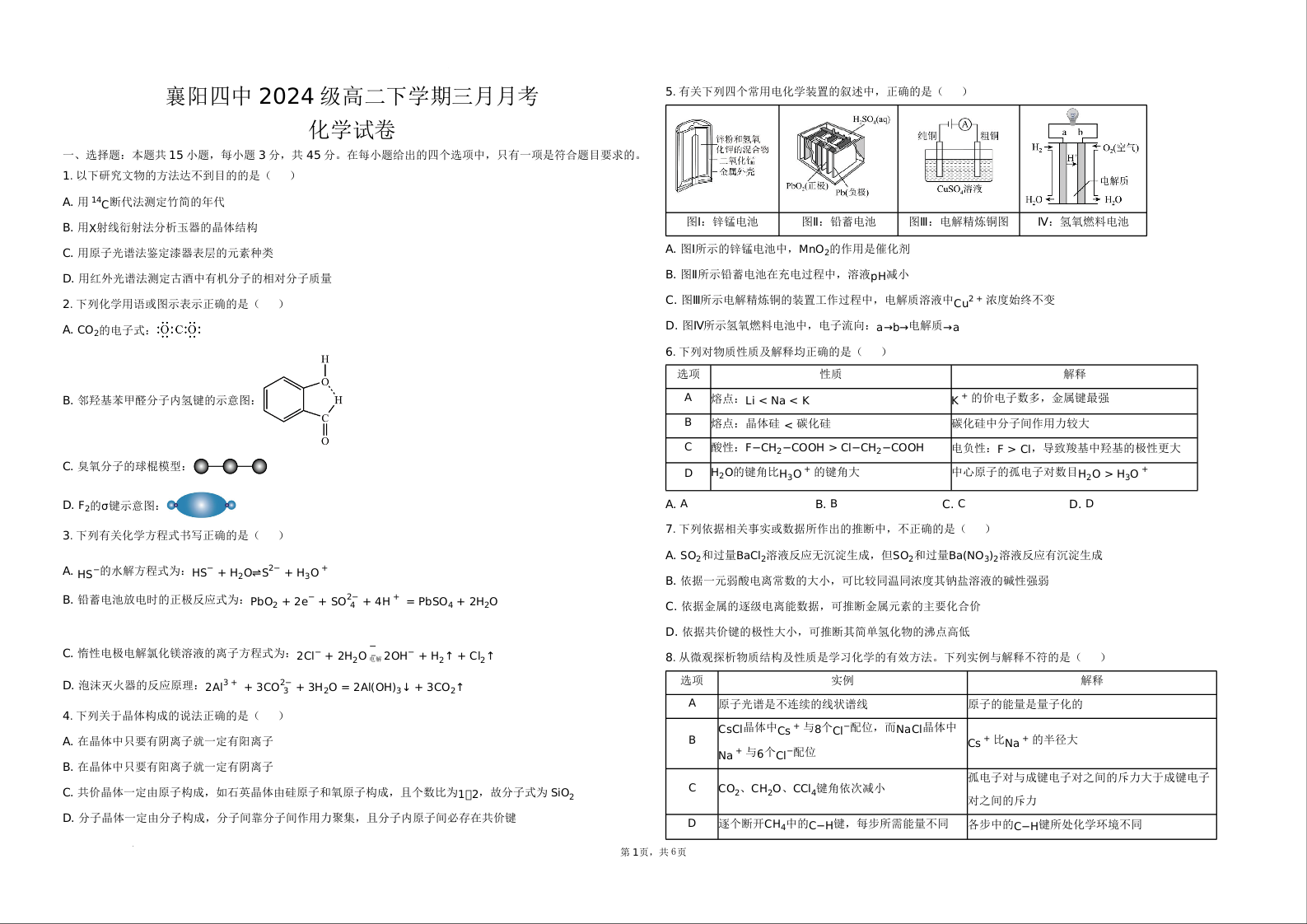 湖北省襄阳市第四中学2025-2026学年高二下学期3月阶段检测 化学试题(含答案).docx