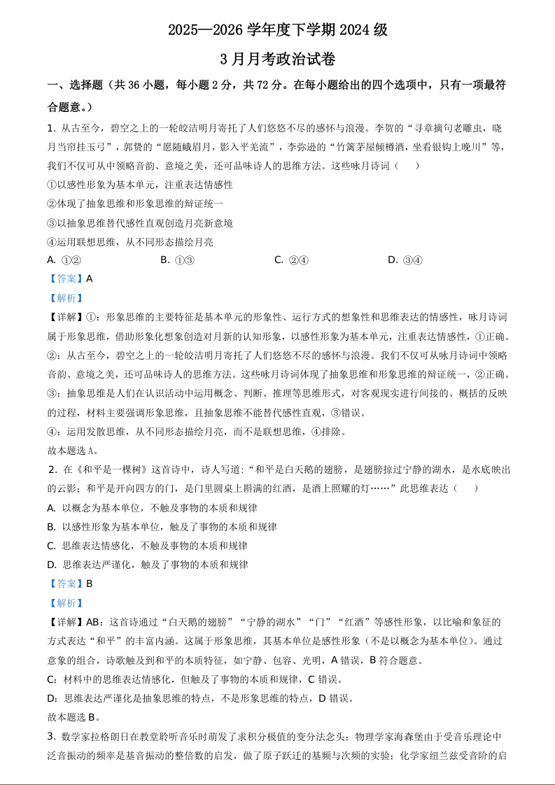 湖北省荆州市沙市中学2025-2026学年高二下学期3月月考 政治答案.docx