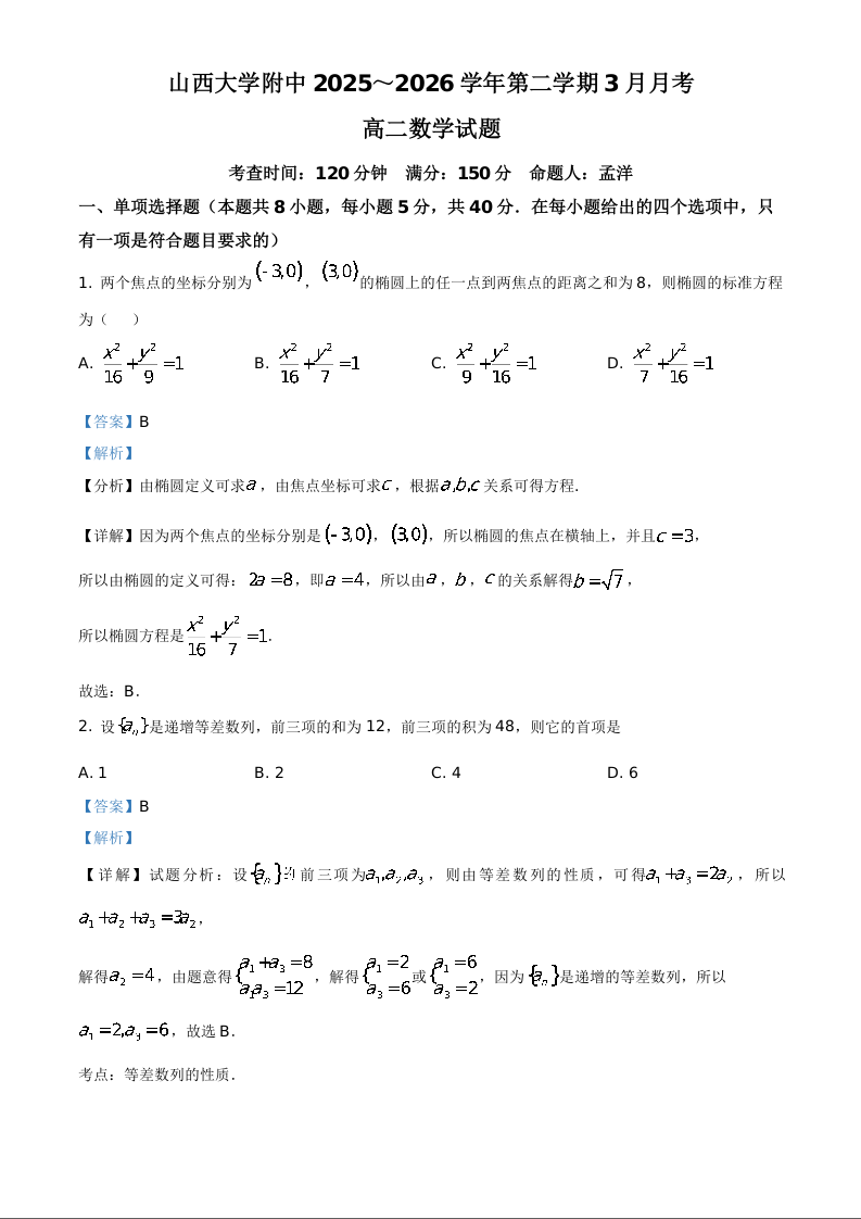 山西大学附属中学校2025-2026学年高二下学期3月阶段检测 数学答案.docx