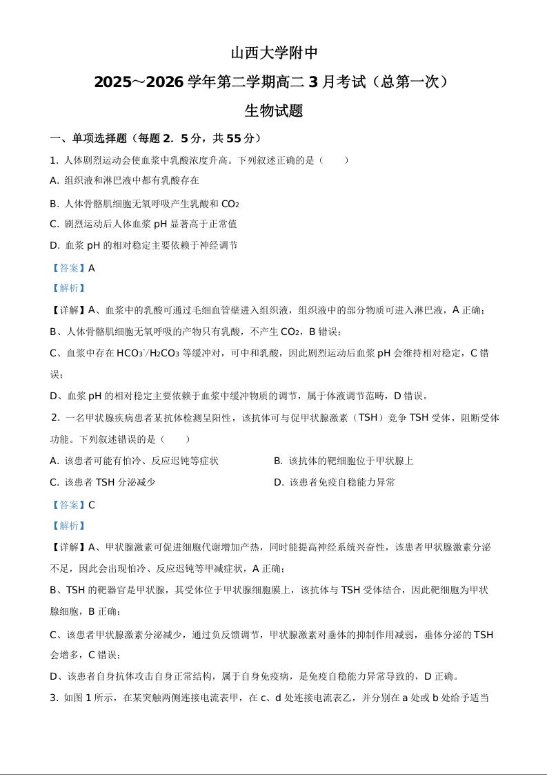 山西大学附属中学校2025-2026学年高二下学期3月阶段检测 生物答案.docx