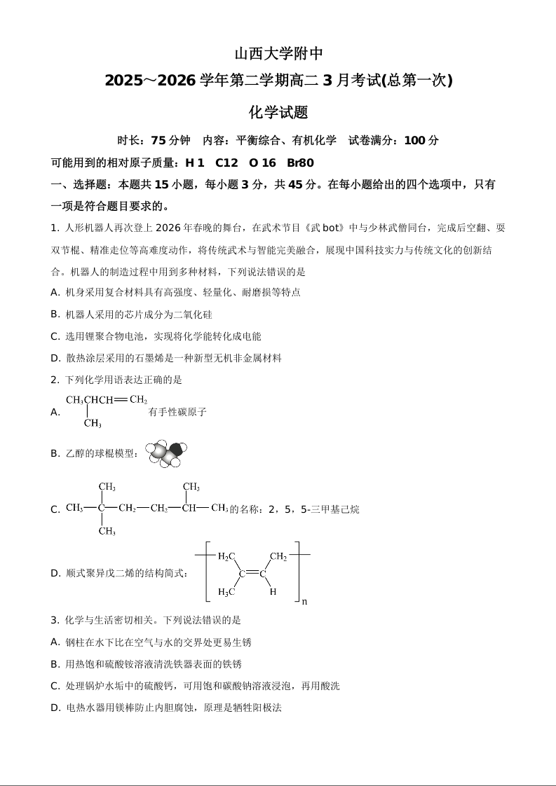山西大学附属中学校2025-2026学年高二下学期3月阶段检测 化学.docx