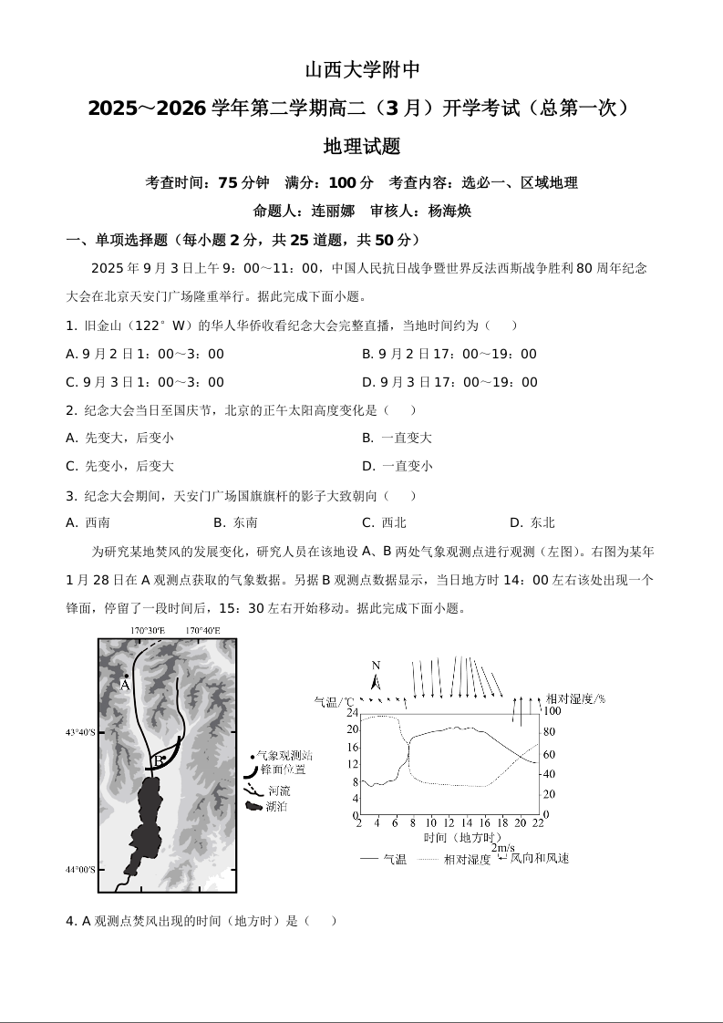 山西大学附属中学校2025-2026学年高二下学期3月阶段检测 地理.docx