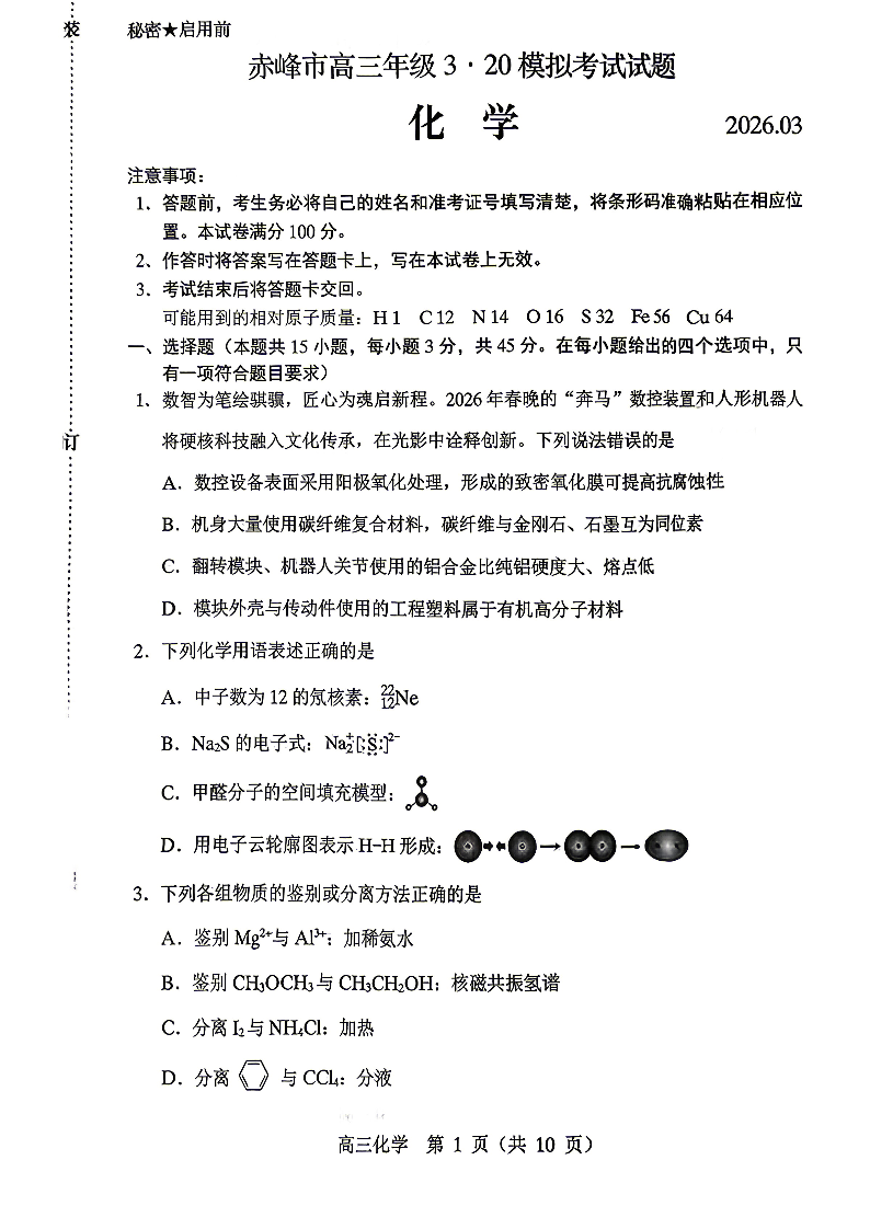 赤峰市2026年高三3·20模拟测试 化学.pdf