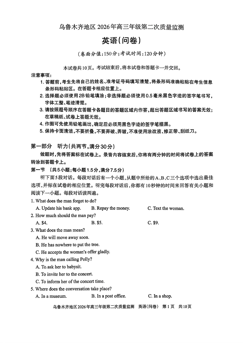 乌鲁木齐地区2026年高三年级第二次质量监测 英语.pdf