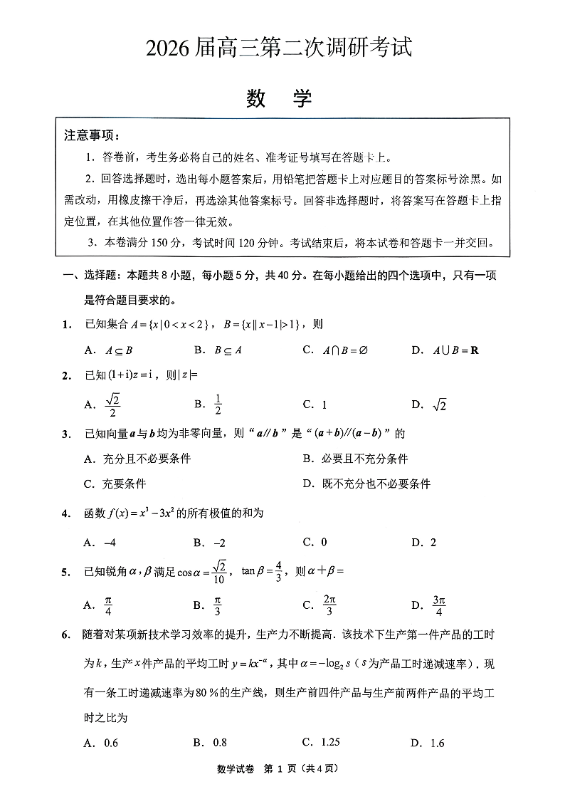 江苏省苏北七市2026届高三下学期第二次调研测试 数学.pdf