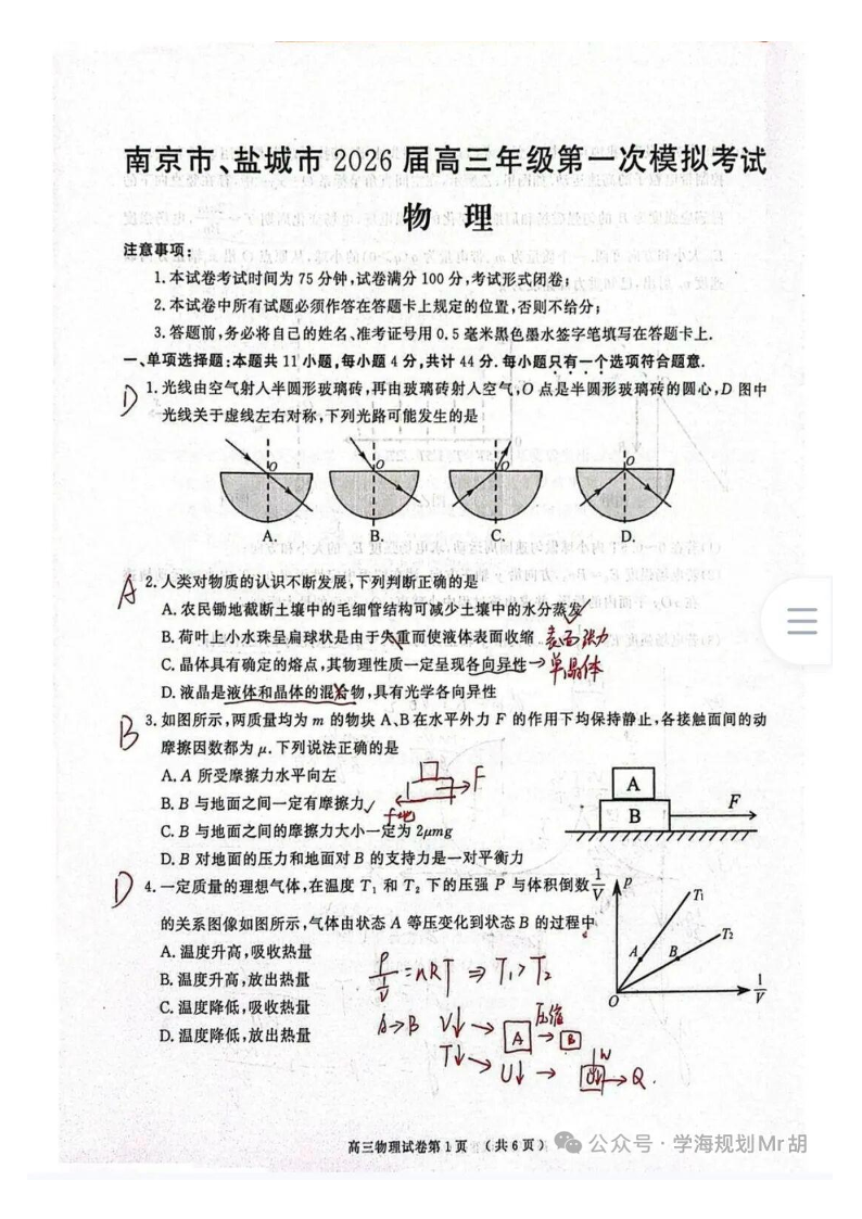 南京市、盐城市 2026届高三年级第一次模拟考试 物理答案.pdf