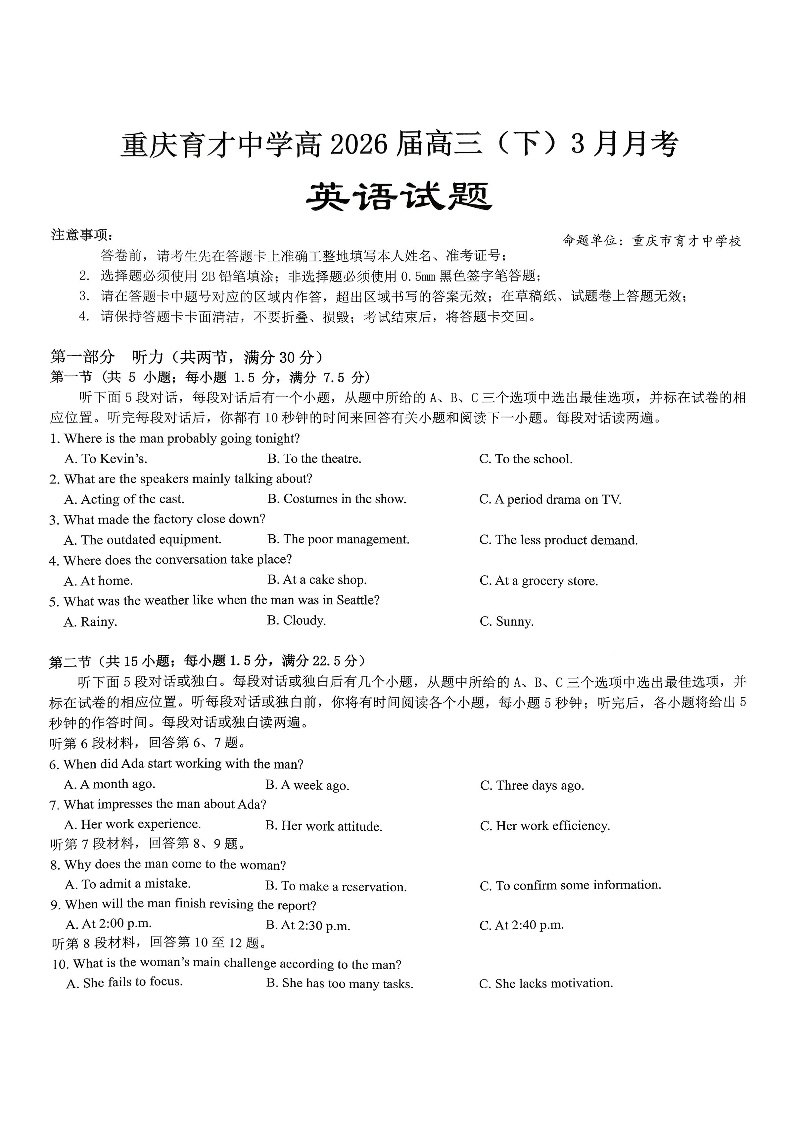 重庆育才中学高2026届高三(下)3月月考 英语.pdf