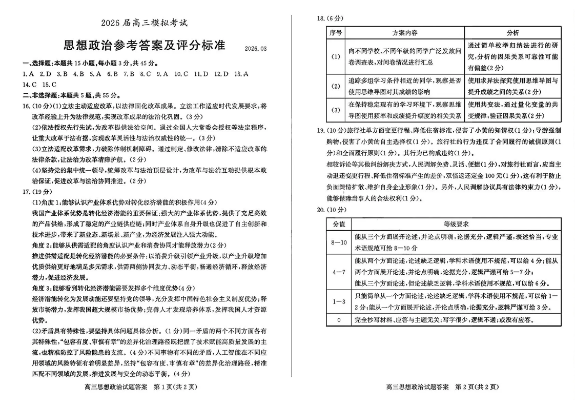 枣庄市2026届高三3月模拟考 政治答案.pdf