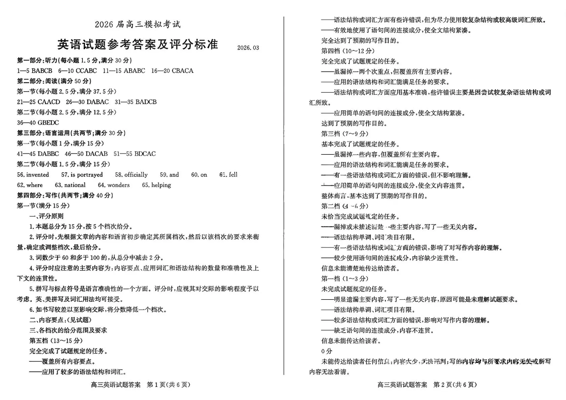 枣庄市2026届高三3月模拟考 英语答案.pdf