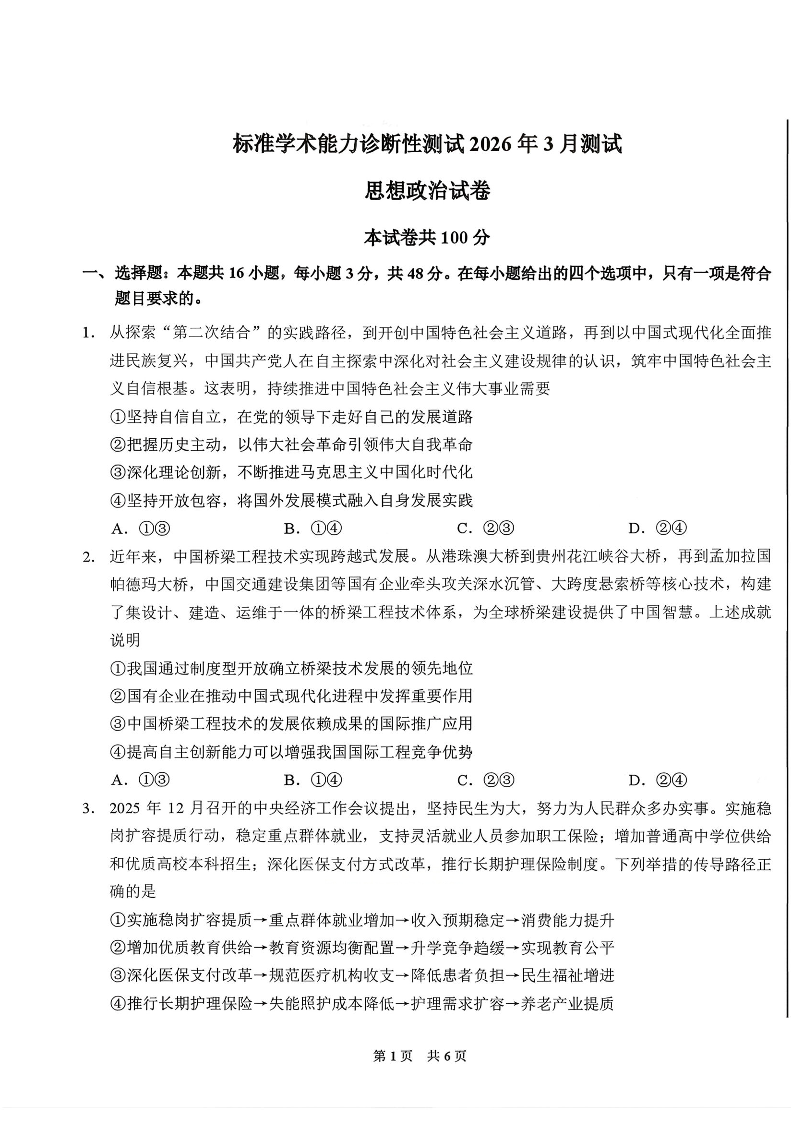 标准学术能力诊断性测试2026年3月测试 政治试题(含答案).pdf