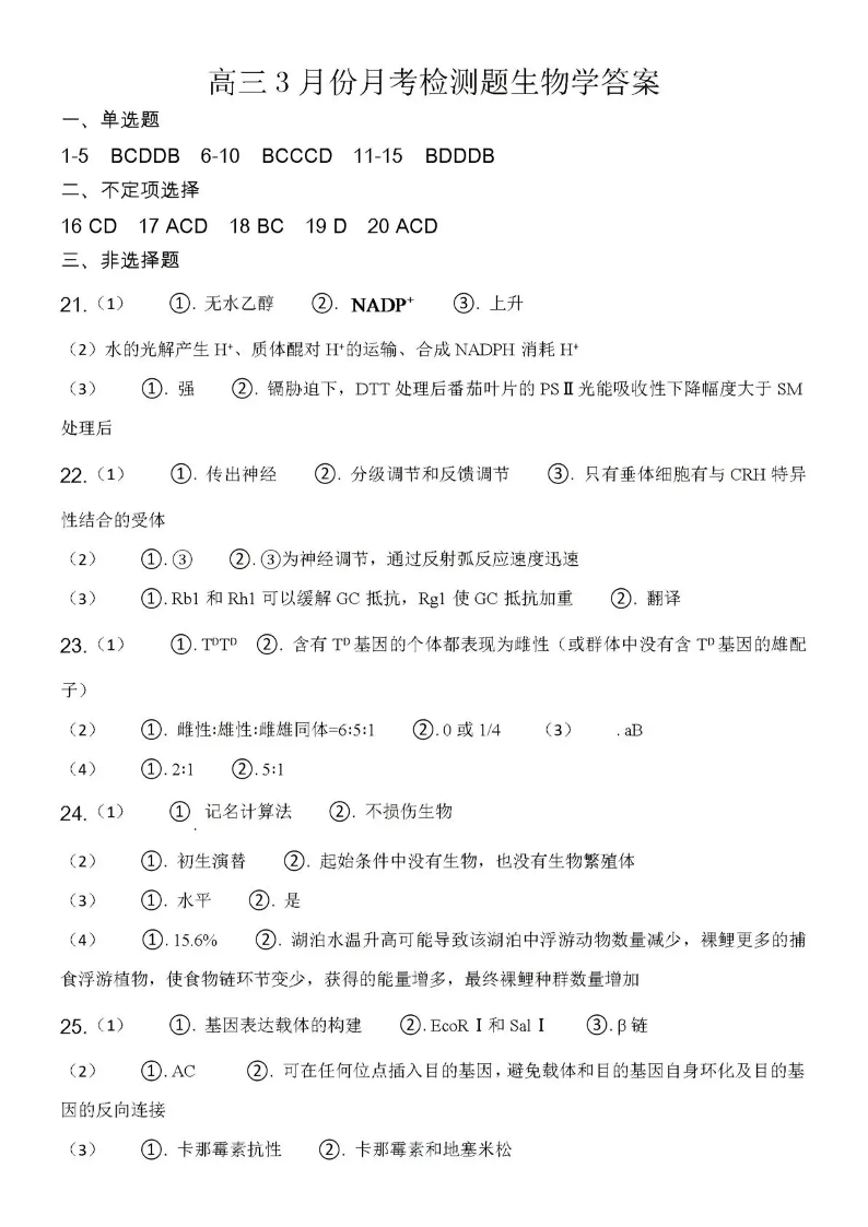 日照市第一中学2025-2026学年高三下学期3月份单元质量检测 生物答案.pdf