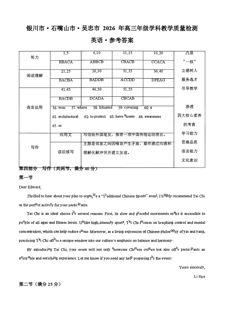 银川市、石嘴山市、吴忠市三市2026年高三年级学科教学质量检测 英语答案.pdf