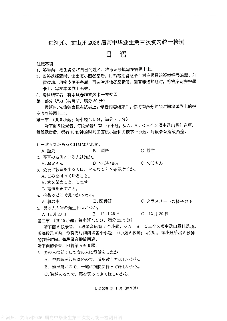 红河州、文山州2026 届高中毕业生第三次复习统一检测 日语.pdf