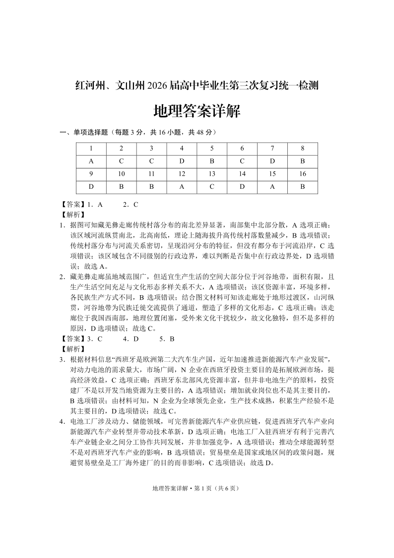 红河州、文山州2026 届高中毕业生第三次复习统一检测 地理答案.pdf