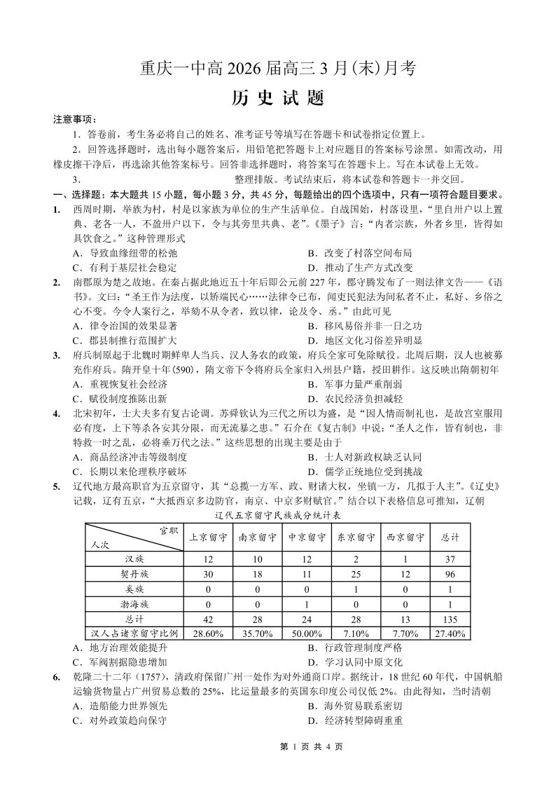 重庆一中高2026届高三3月(末)月考 历史.pdf