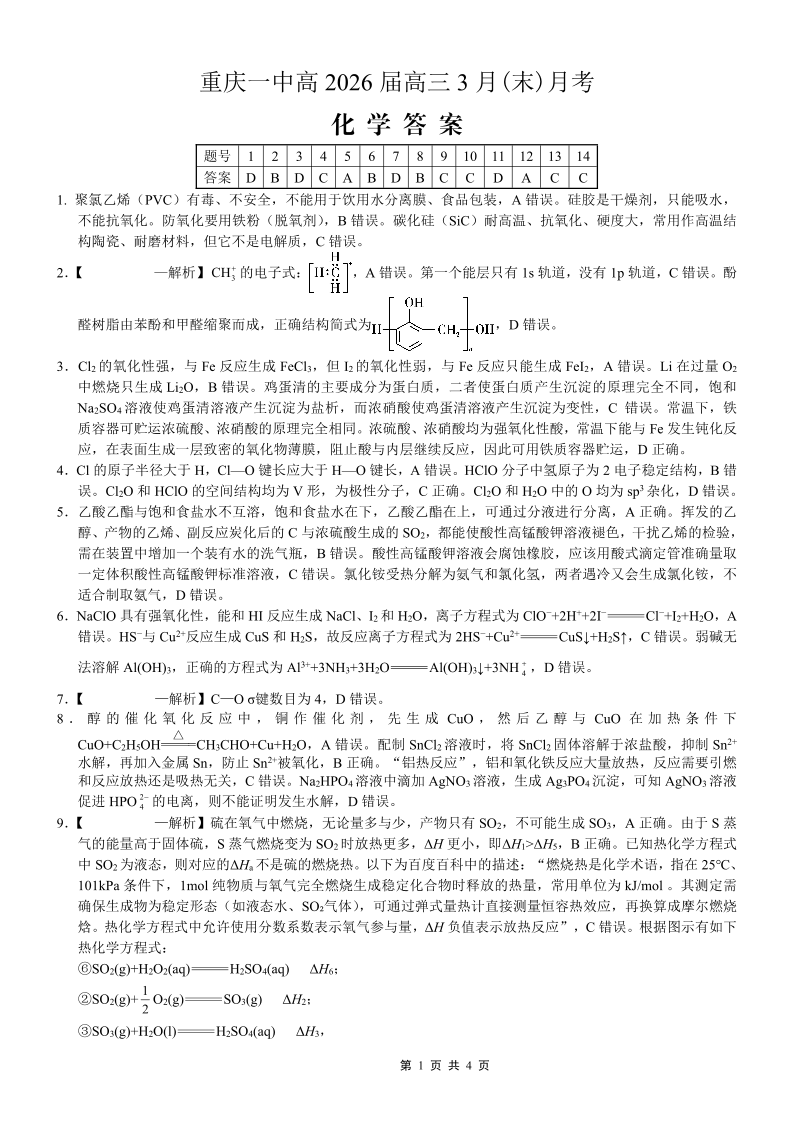 重庆一中高2026届高三3月(末)月考 化学答案.pdf