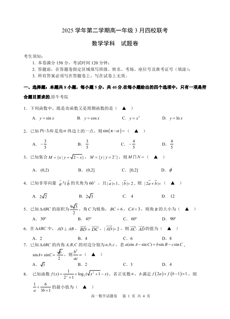 浙江省四校(含精诚联盟)2025-2026学年高一下学期3月阶段检测 数学.pdf