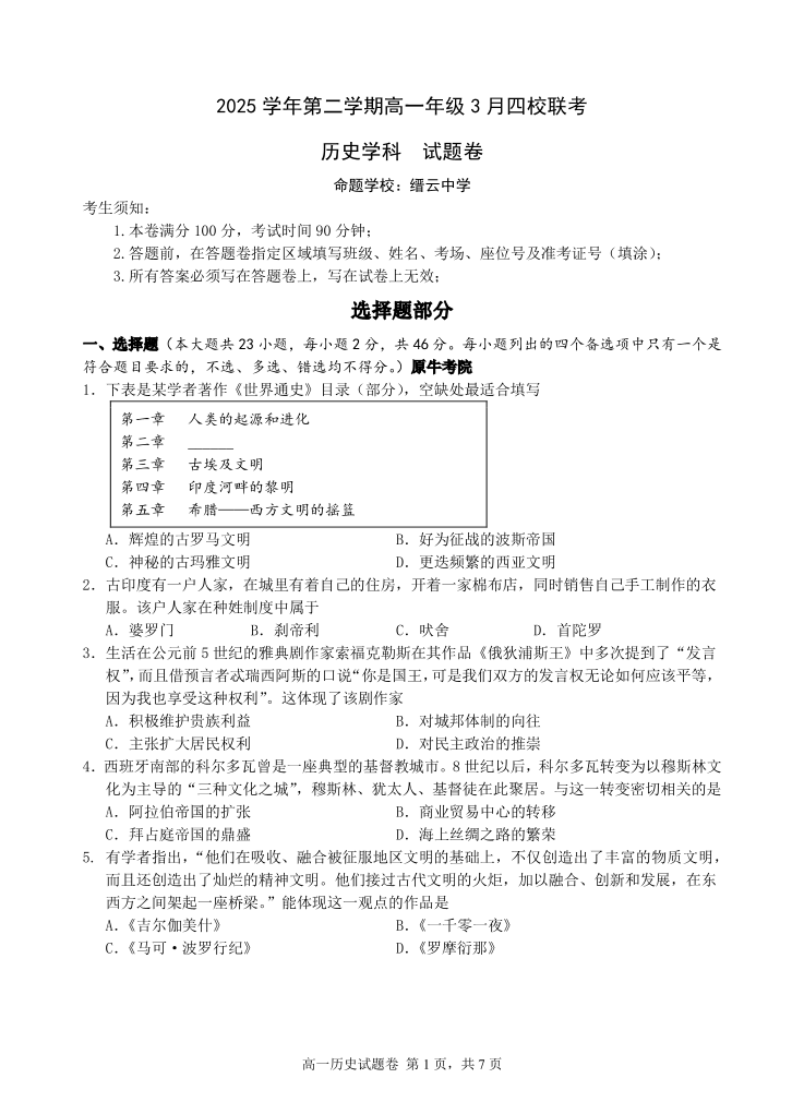 浙江省四校(含精诚联盟)2025-2026学年高一下学期3月阶段检测 历史.pdf