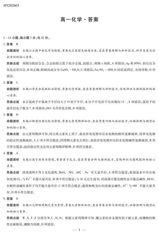 河南天一大联考2026年高一年级下学期3月大联考 化学答案.pdf