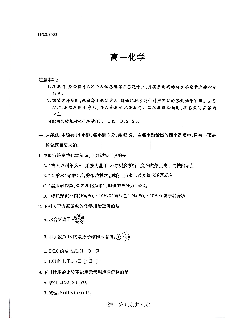 河南天一大联考2026年高一年级下学期3月大联考 化学.pdf