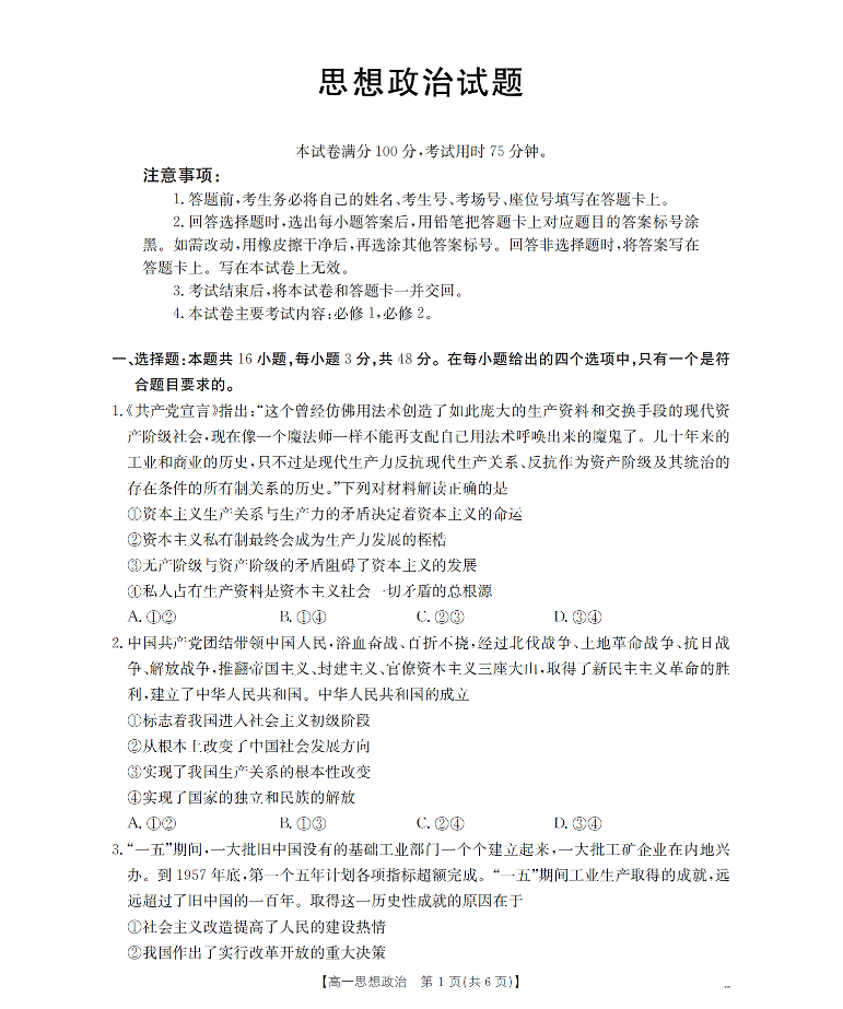 河北省定兴第三中学2025-2026学年高一3月开学联考 政治.pdf
