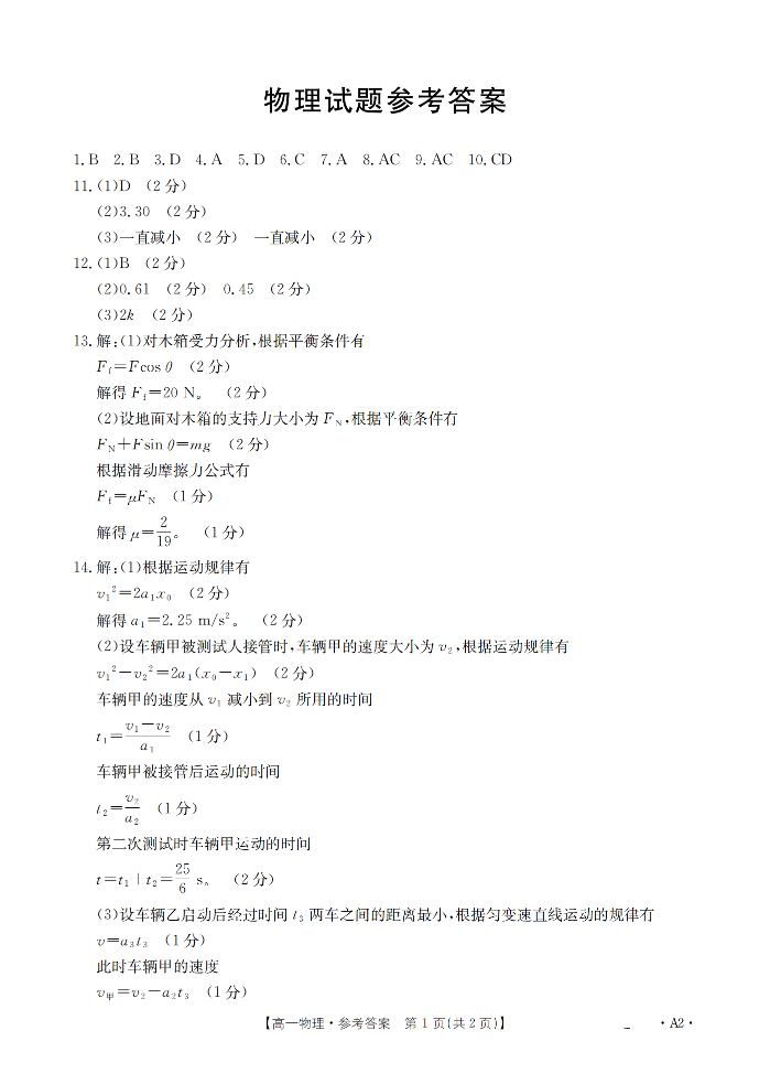 河北省定兴第三中学2025-2026学年高一3月开学联考 物理答案.pdf