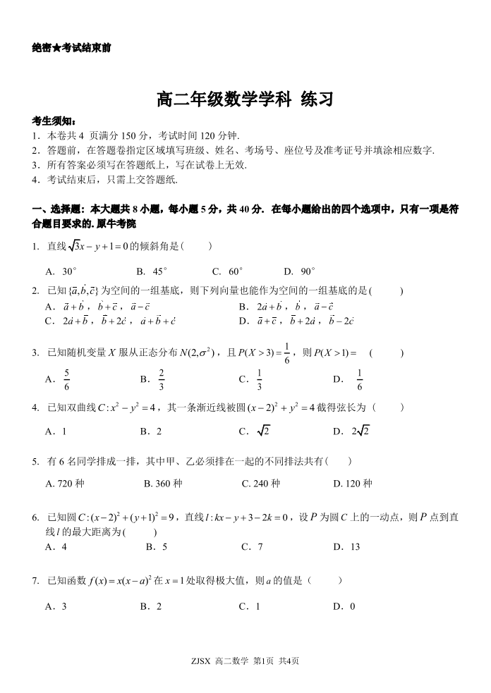 浙江四校(含精诚联盟)2025-2026学年高二下学期3月阶段检测 数学.pdf