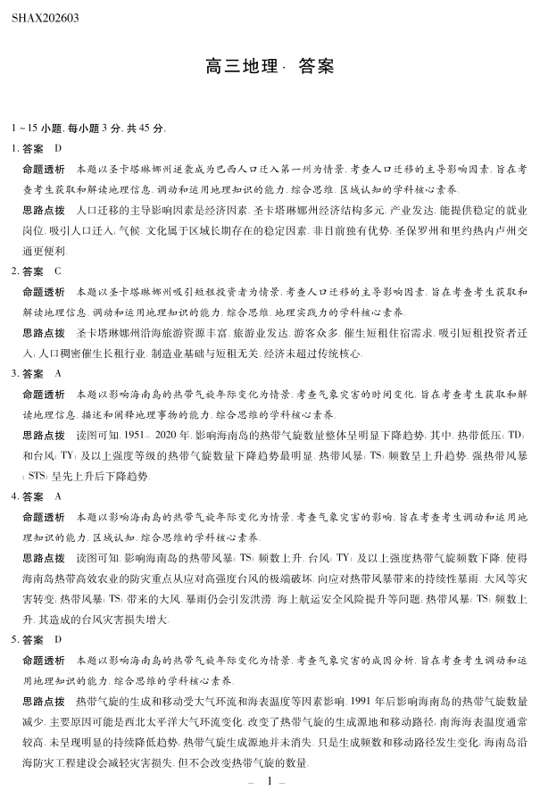 山西省阳泉市2026年3月高三年级第一次模拟测试 地理答案.pdf