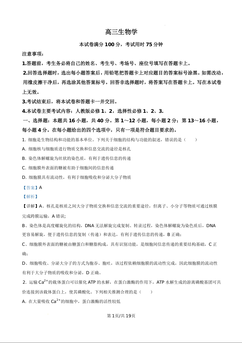 广西崇左市2026届高三下学期3月一模(崇左一模)生物答案.docx