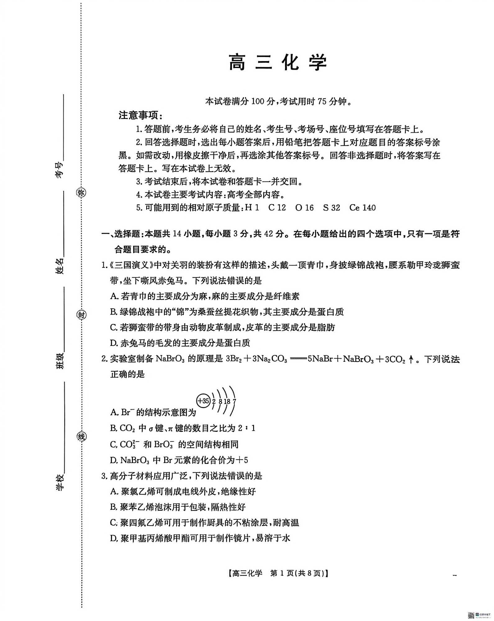 广西崇左市2026届高三下学期3月一模(崇左一模)化学.pdf