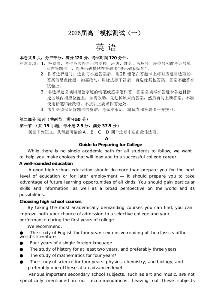 中山市2026届高三模拟测试(一)英语.docx